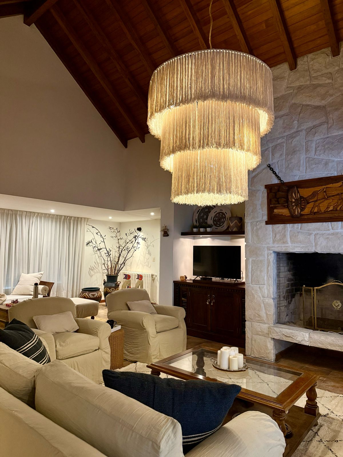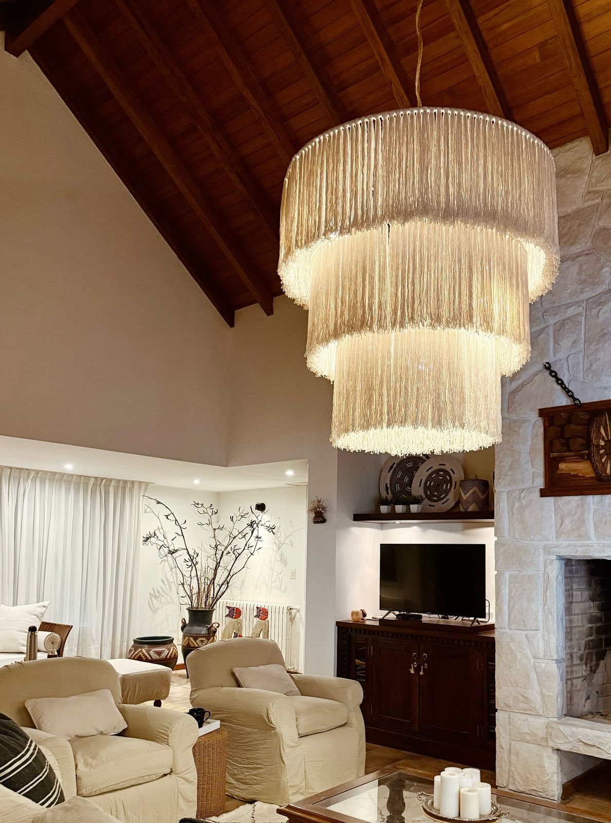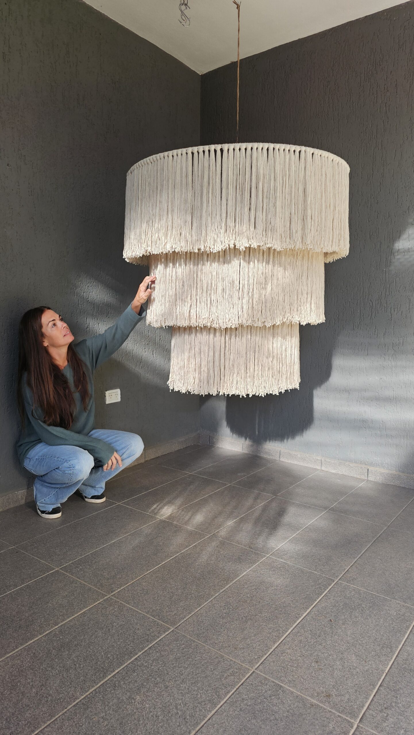 ESTRUCTURA DE HIERRO DE 3 PISOS CON FLECOS DE HILO DE ALGODON.
