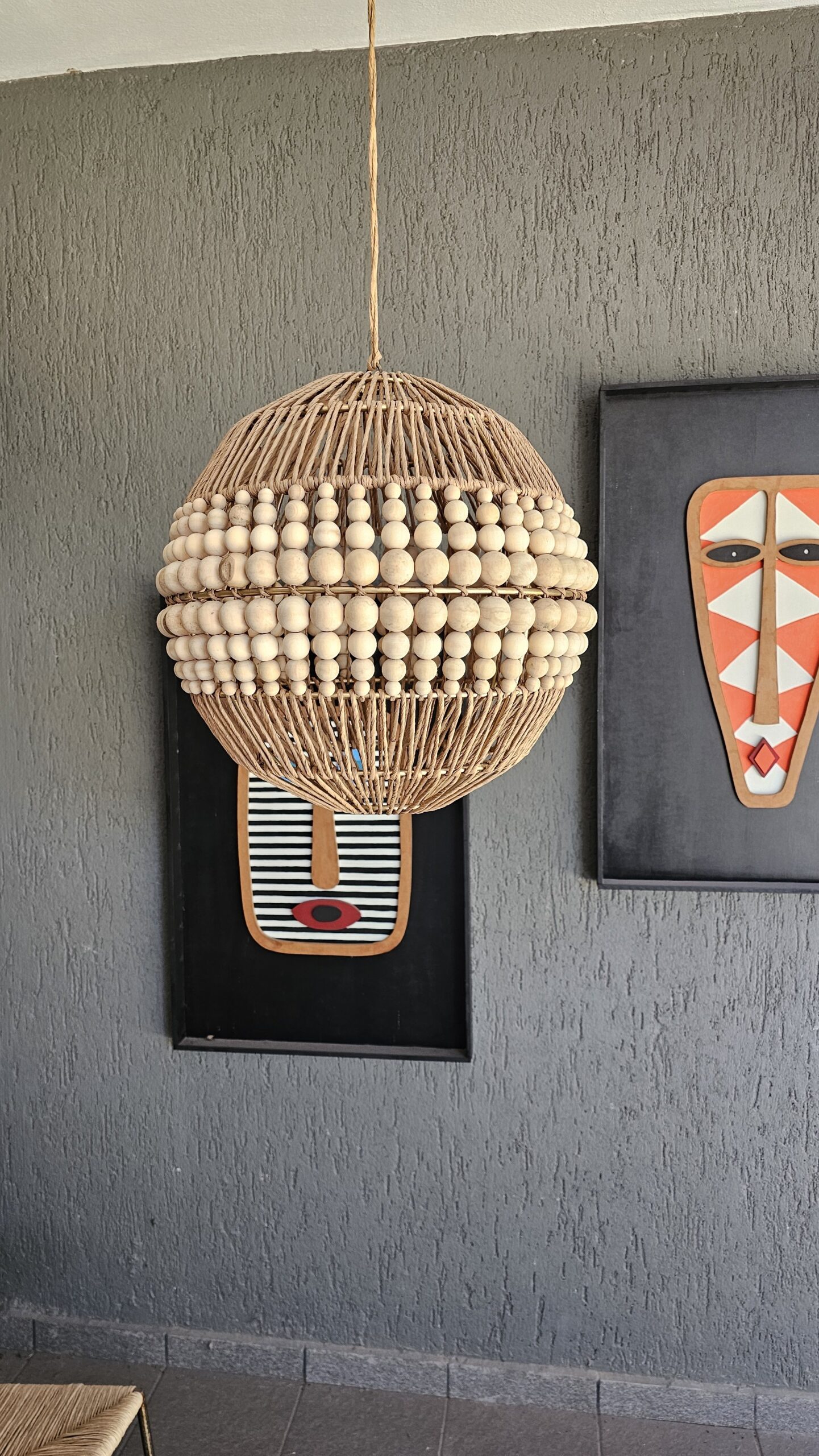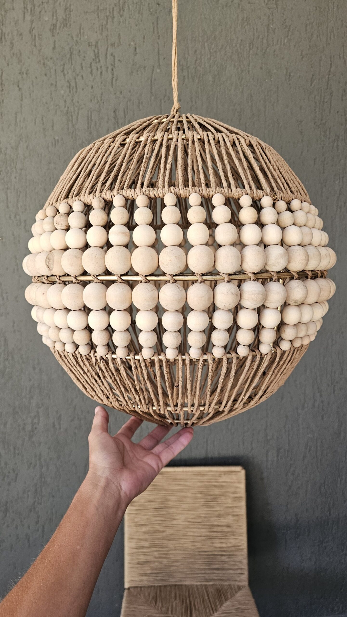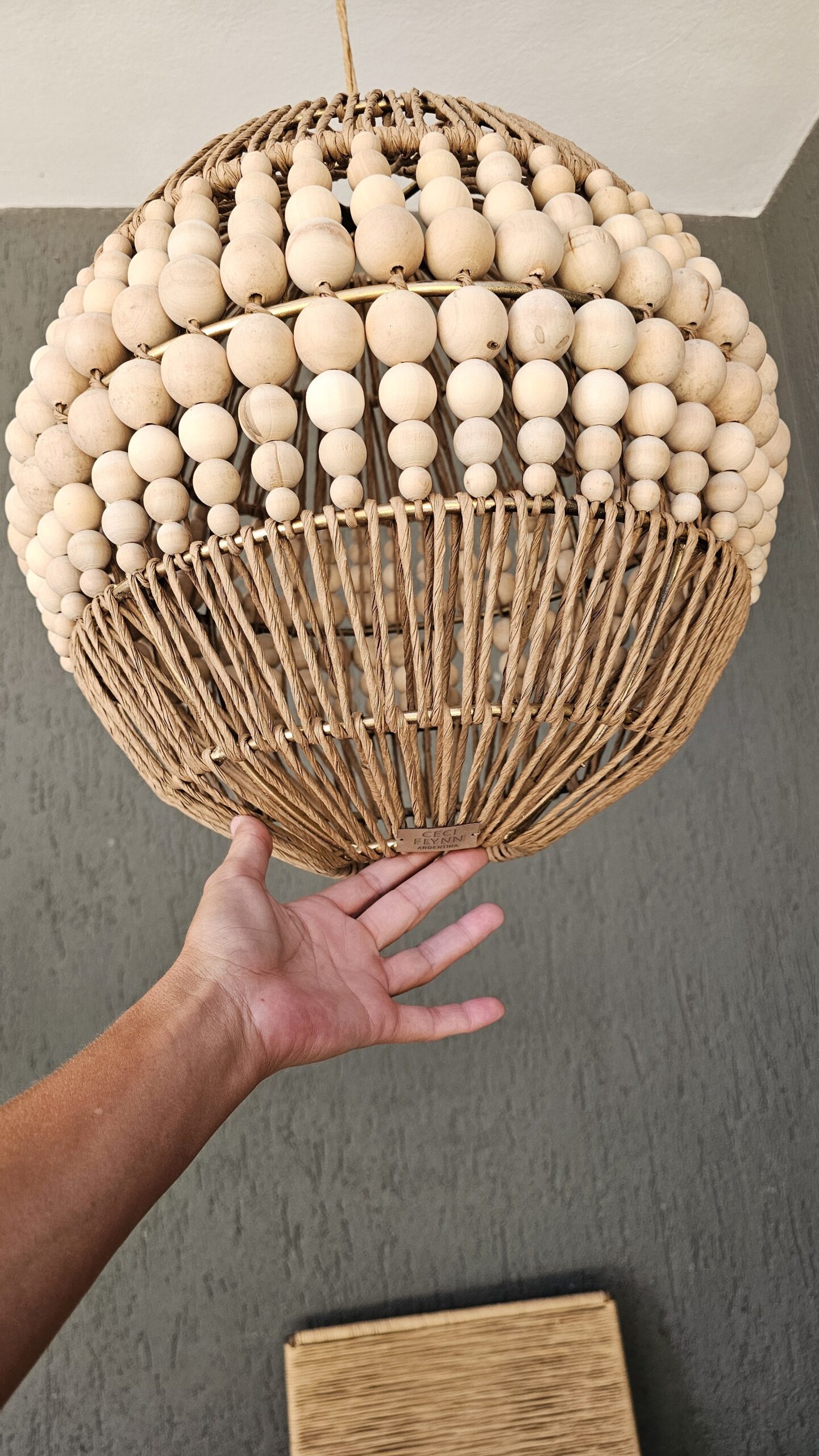 ESTRUCTURA COBRE, TEJIDO CON CRAFT Y BOLONES DE MADERA.