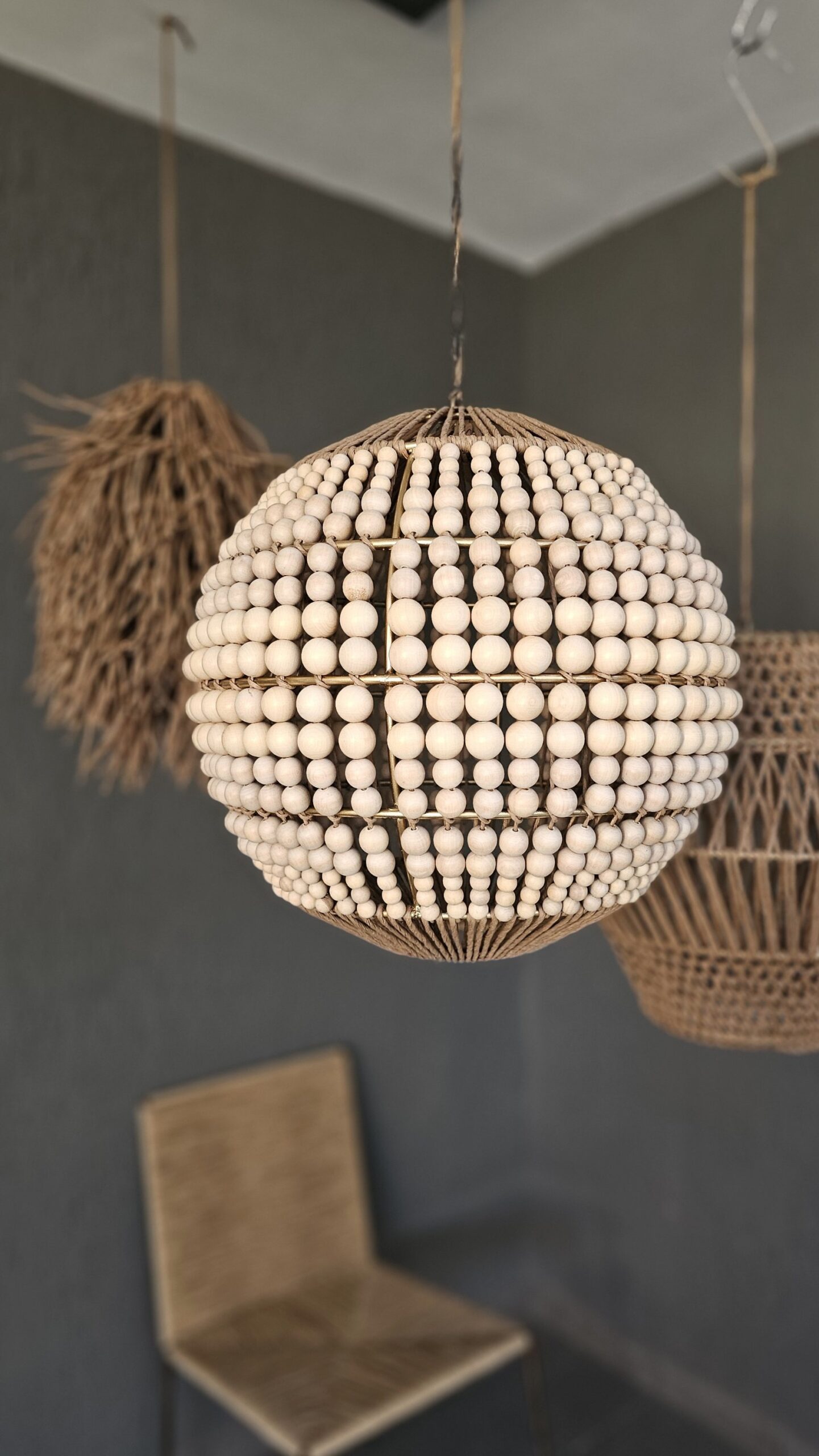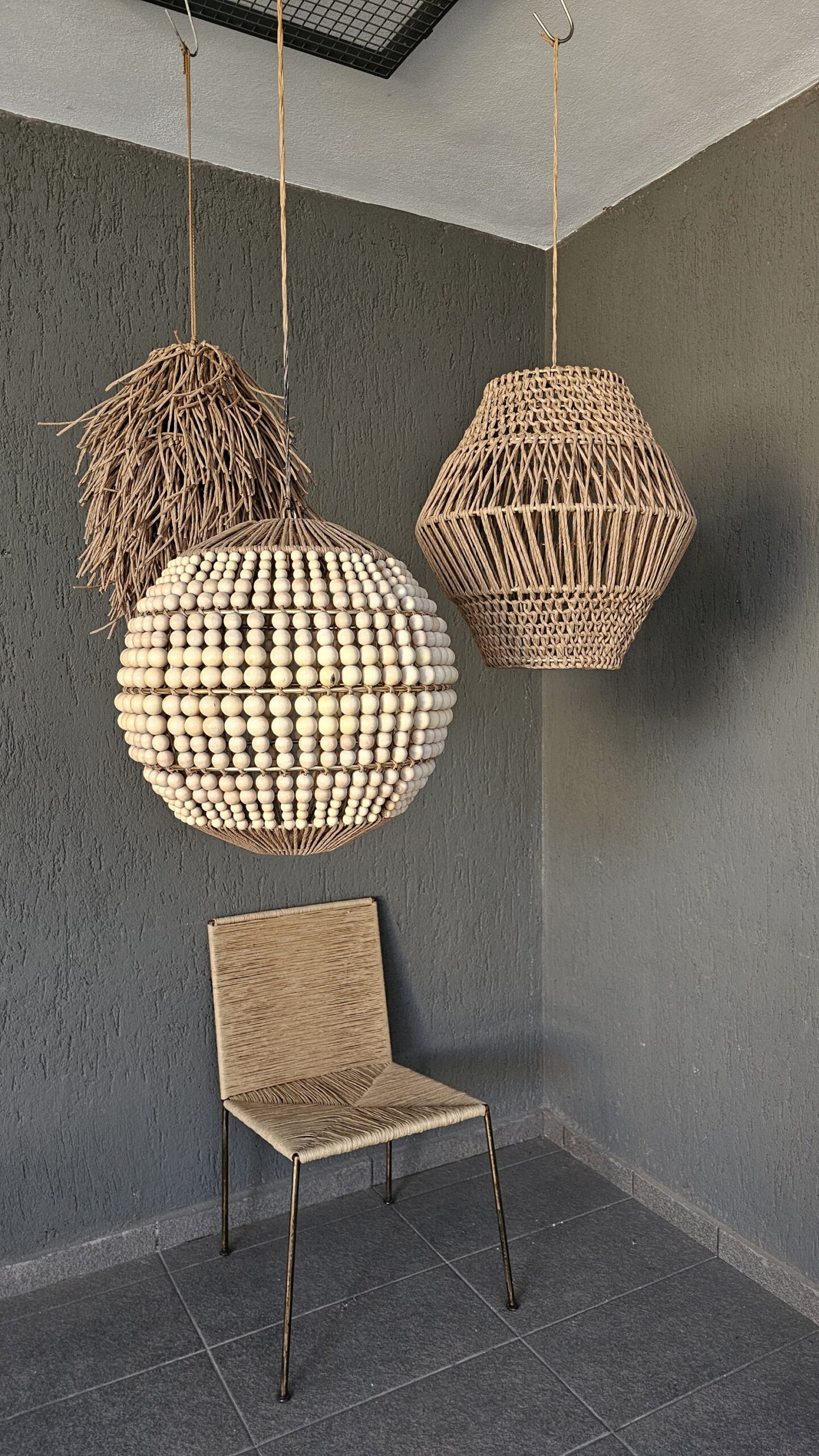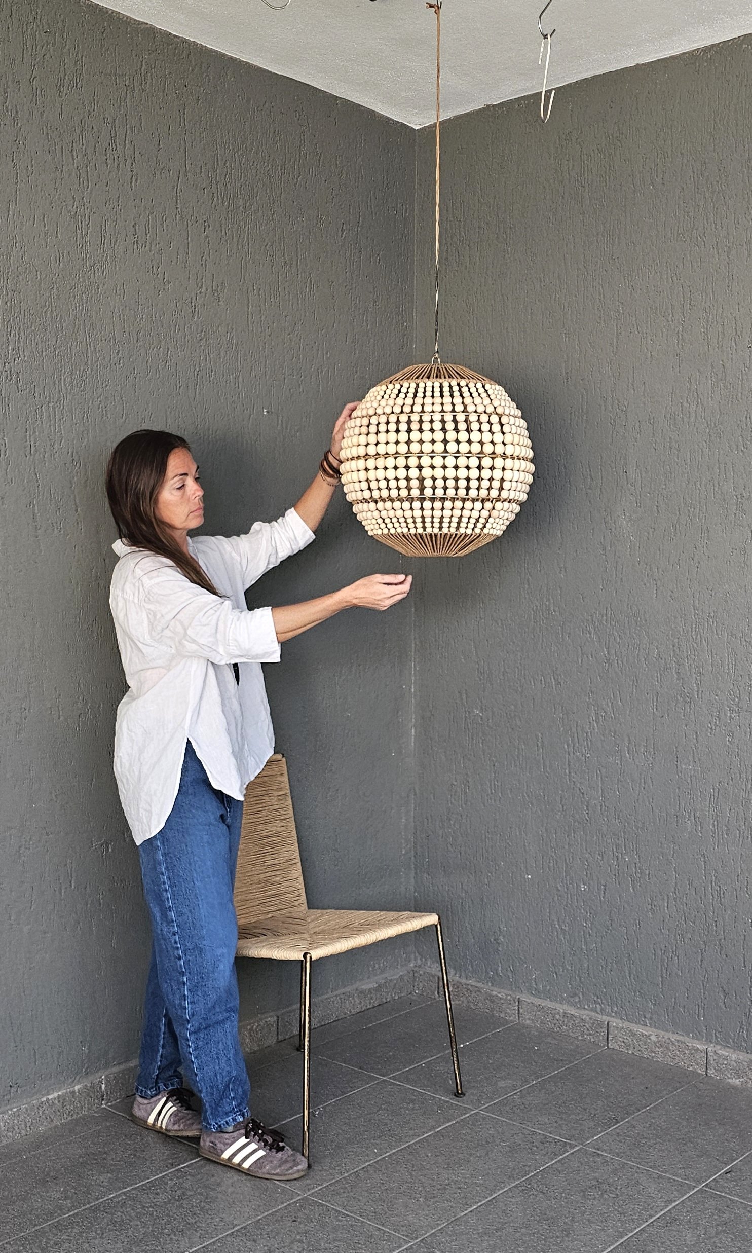 ESTRUCTURA DE HIERRO COBRE, TEJIDO CON HILO CRAFT NATURAL Y 4 PISOS DE BOLONES DE MADERA.