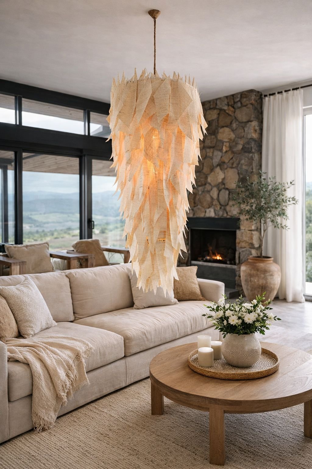 LAMPARA DE ESTRUCTURA DE HIERRO Y «FLECOS» IRREGULARES DE TELA RUSTICA.